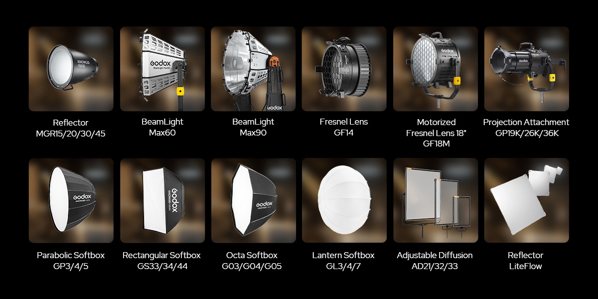 MG4K, reflektörler, Fresnel, Beamlight, projeksiyon ataşmanları, softbox’lar, Liteflow ve ayarlanabilir difüzyon seçenekleri dahil